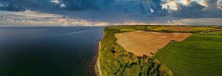 Cliff on sea shore at sunrise. Baltic sea in autumn from drone.Nature from a birds eye view. From air.