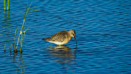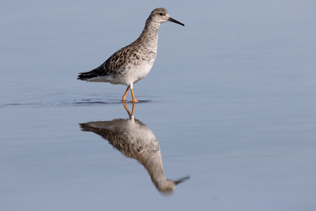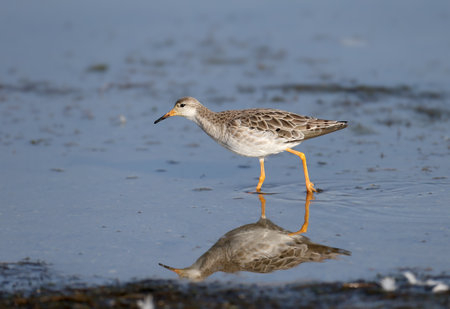 An adult The ruff (Calidris pugnax) in winter plumage stands in blue water