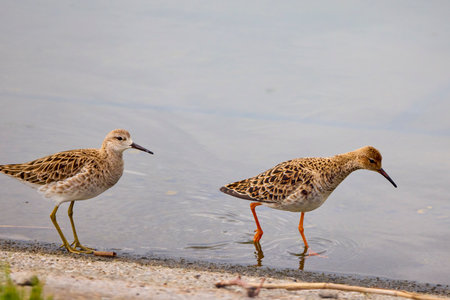 Philomachus pugnax. Two ruffs in the evening on the lake