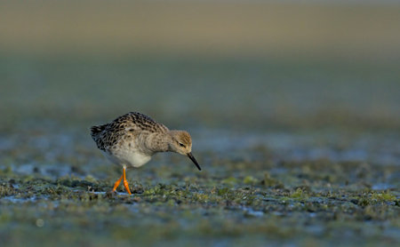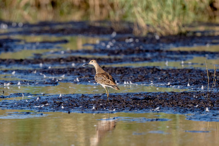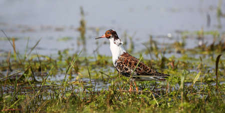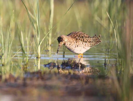 The ruff (Calidris pugnax) surrounded by aquatic plants in soft morning light