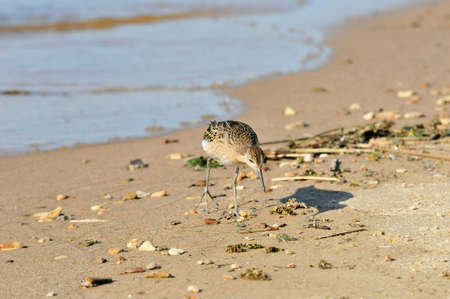 A wild bird searching for food on the beach