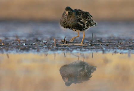 Ruff (Calidris pugnax) male walking in the wetlands.