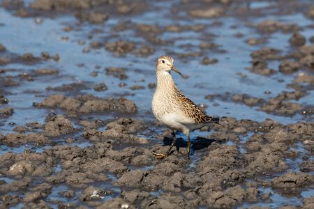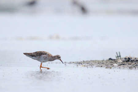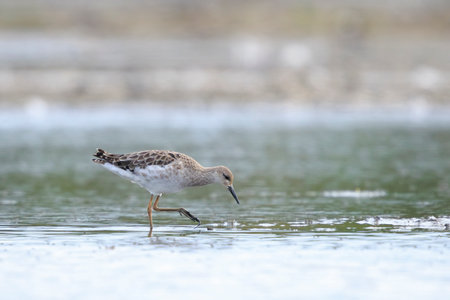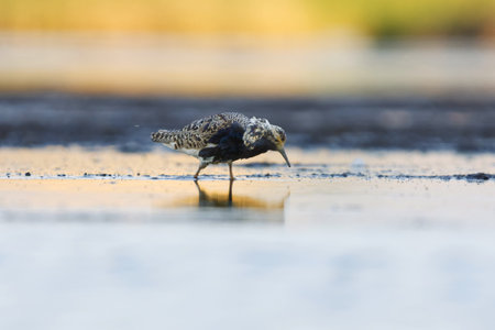 Close-up of a Ruff, Calidris pugnax, wading bird foraging in wetlands