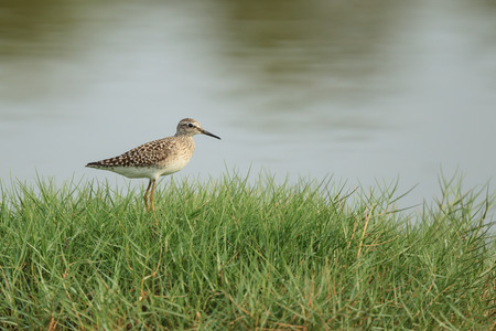 A Wood Sandpiper is resting in the green grass in front of a pond