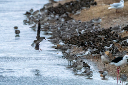 A flock of red-billed sandpipers (Larus ridibundus) in the wild.