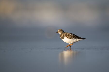 A Ruddy Turnstone walks in shallow water in the golden sunlight with a smooth blue background.
