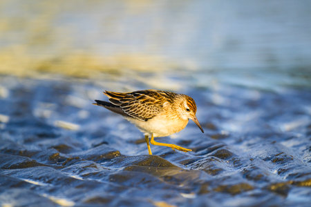 A pectoral sandpiper, Calidris melanotos, foraging in wetland. Low point of view.
