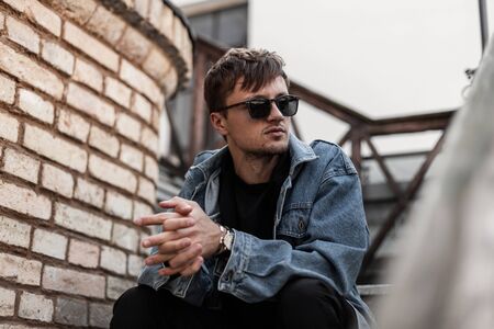 Stylish American young man hipster in trendy blue denim clothes in black sunglasses sits on a vintage staircase near brick wall in the city on a warm spring day. Urban attractive guy resting outdoors.