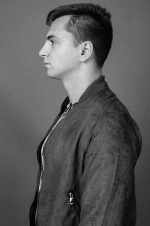 Studio shot of young handsome man against gray background