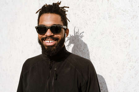 Afro Man in good mood with sunglasses poses over modern urban background.