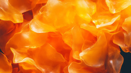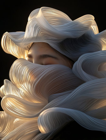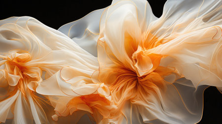 This image captures abstract flowing shapes, illuminated by warm light against a dark backdrop. The delicate textures and patterns evoke feelings of beauty and fluidity.