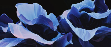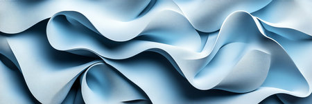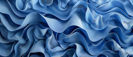 A 3D render of an abstract blue background, folded ribbons macro, and a fashion wallpaper with wavy layers and ruffles.