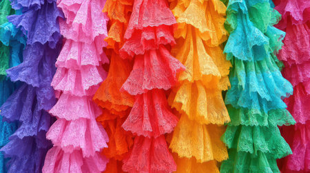 An eye-catching display of vibrant ruffled lace fabric showcasing a spectrum of colors. Perfect for fashion design, textile art, and creative projects.