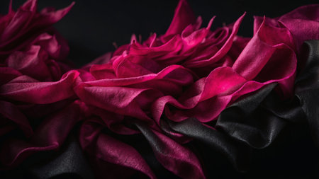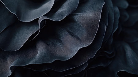 This image showcases a close-up of dark fabric with beautifully layered ruffles, highlighting its elegant texture and rich details suitable for various design projects.