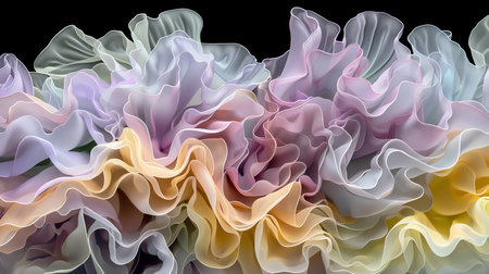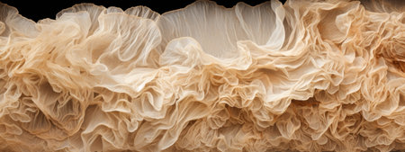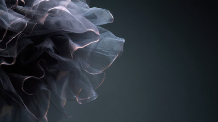 An elegant close-up of soft black tulle fabric featuring delicate ruffles. The smooth textures create an ethereal and graceful appearance, ideal for artistic designs.
