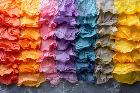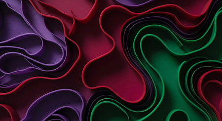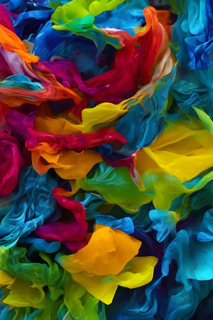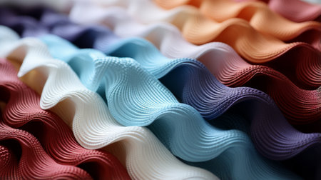 Abstract display of vibrant, overlapping fabric waves in warm and cool colors, creating a textured background. ideal for use in creative design projects, artistic visuals, or as a striking backdrop. Generative AI