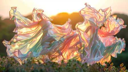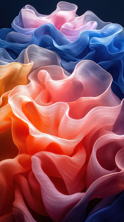 This visually captivating image showcases colorful abstract waves resembling flowing fabric, featuring a seamless blend of soft textures and elegant hues.