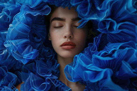 Woman Dreaming among Delicate Blue Petals of a Flower Garden, Eyes Closed in Peaceful Bliss