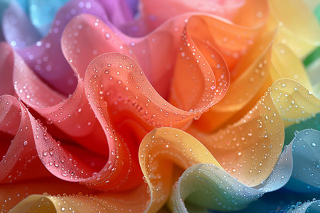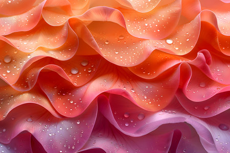 Close-up of vibrant, ruffled petals in warm shades of orange, pink, and purple with water droplets delicately scattered across the surface. the intricate texture and interplay of colors create a mesmerizing abstract design ideal for various artistic uses. Generative AI