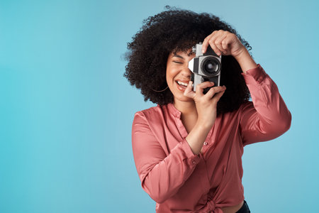 Beautiful young african woman using camera and photographing on blue background