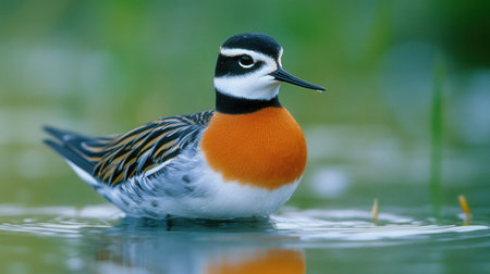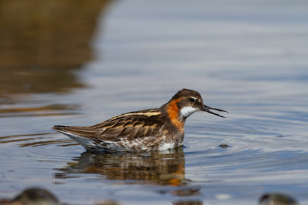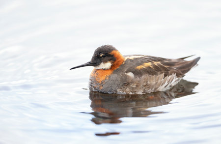 Close up of a Red-necked phalarope (Phalaropus lobatus) in water, Iceland.
