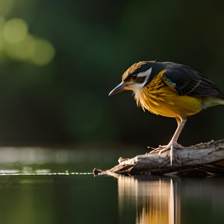 A captivating image of a bird splashing in water, creating ripples and droplets. Soft lighting enhances the tranquil beauty of this wildlife moment.