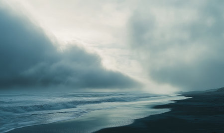 Black sand beach in the fog. Beautiful seascape. Toned.