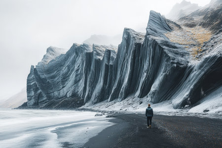 A person walks along a black sand beach, gazing at towering, rugged cliffs that rise dramatically from the shoreline in a misty and atmospheric setting in Iceland.