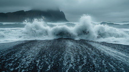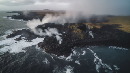 Generative AI : Aerial view of waves breaking along the coast at Hvalnes Nature Reserve Eastern Iceland