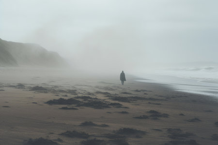 Mysterious Figure: A Lone Walker Embracing the Misty Seashore