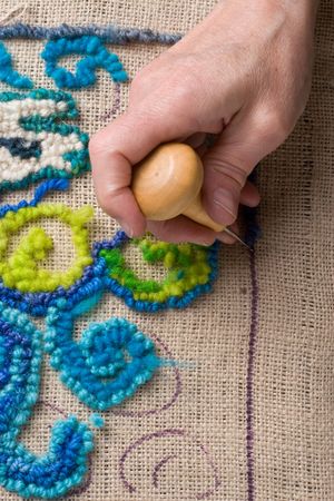 Hands work a hook in hug hooking craft.