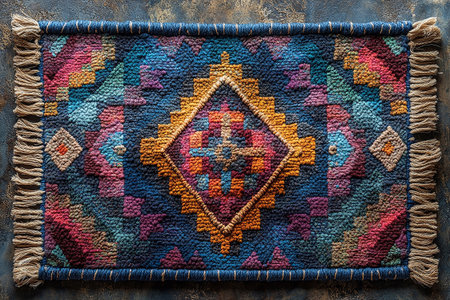 Colorful woven textile with intricate patterns and tassels. That the image is generated using AI.