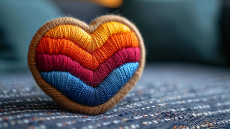 Close-up of a colorful embroidered heart, showing the vibrant texture and intricate details of the craft.