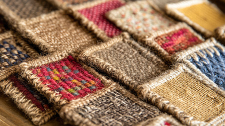 A close-up view of colorful textile samples showcasing rich patterns and textures made from natural fibers, ideal for design inspiration and decoration.