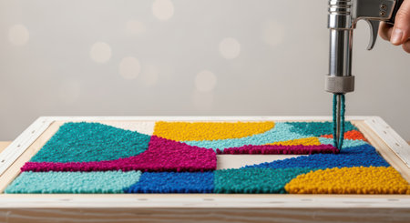 Close-up of manual tufting gun creating colorful abstract textile rug