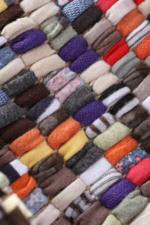 Colorful woolen socks for sale in a market, closeup