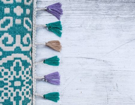 Colorful able runner with tassels on a white rustic table