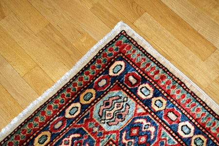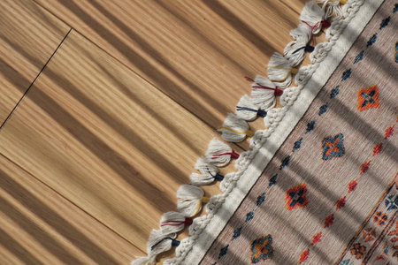 Detailed view of a colorful rug with tassels on wooden floor