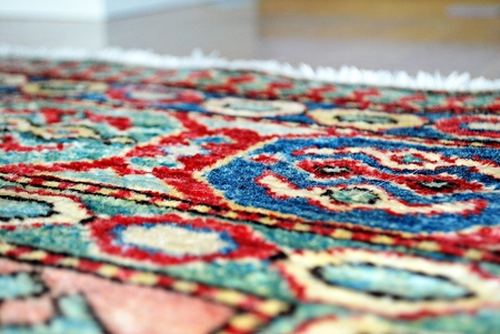 A colorful oriental rug with a blue background. The rug is made of different colored threads and has a fringe