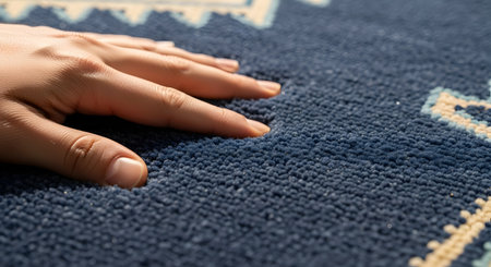 A close-up shot of a hand gently pressing into the surface of a soft, blue low-pile carpet, feeling its texture. The image emphasizes the sense of touch, comfort, and the quality of the material used in home flooring and decor.