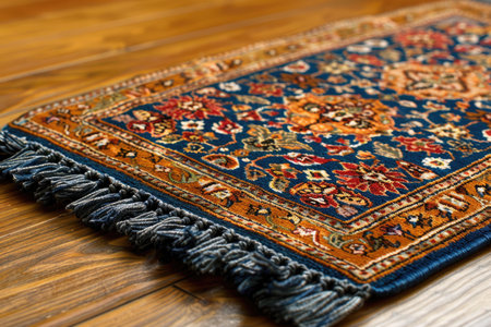 Intricate Islamic Prayer Rug Close-Up on Wooden Floor. Detail of Colorful Design and Texture. Concept of Ramadan, Spirituality, Cultural Heritage, Traditional Craftsmanship, Religious Practices.