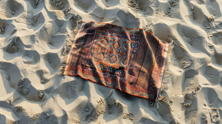 Magic carpet with bold patterns and intricate borders on floor. Copy space