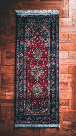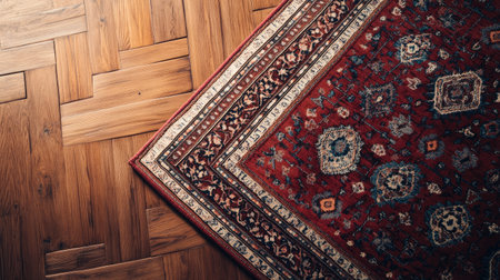 Close-up of a vintage Persian rug elegantly placed on a wooden floor, showcasing intricate patterns and rich colors, adding warmth and charm to any interior space.