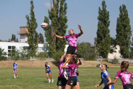 Odessa, Ukraine - August 22, 2020: Ukrainian Cup among women rugby teams Odessa. Tense moment of girls' rugby fight. Dramatic challenging game for women's rugby team