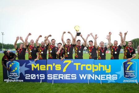 Zagreb, Croatia - 16th June, 2019 : Stjepan Spajic Stadium - European Championship in Rugby 7, mens finals : Belgium vs Ukraine. Belgium players celebrate won 26: 7 and the first place.