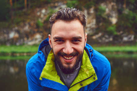 Portrait of a young, bearded man, on, against a background of wildlife. The concept of expedition, adventure and camping life.