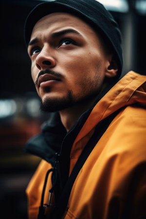 From below bearded male in black hoodie looking at camera against gray overcast sky on rainy day