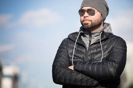 Confident attractive man with serious face. Portrait of handsome man outdoor face. Confident fashion man hipster.
