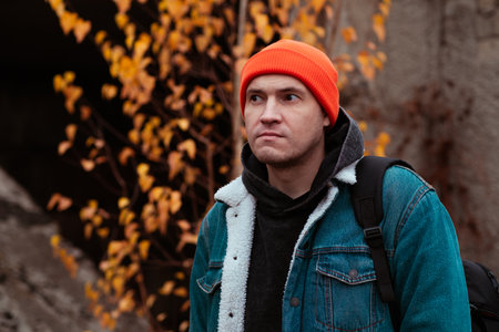 A young man stands outside wearing an orange beanie and denim jacket surrounded by colorful autumn leaves He looks thoughtful against a weathered backdrop of an urban environment