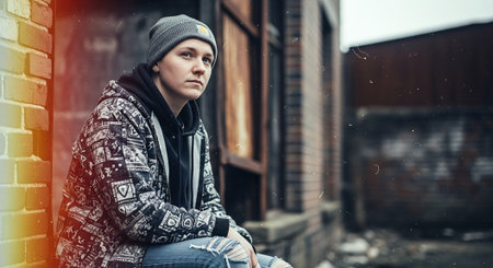 Portrait of a handsome young man in a knitted cap and jacket sitting on the street